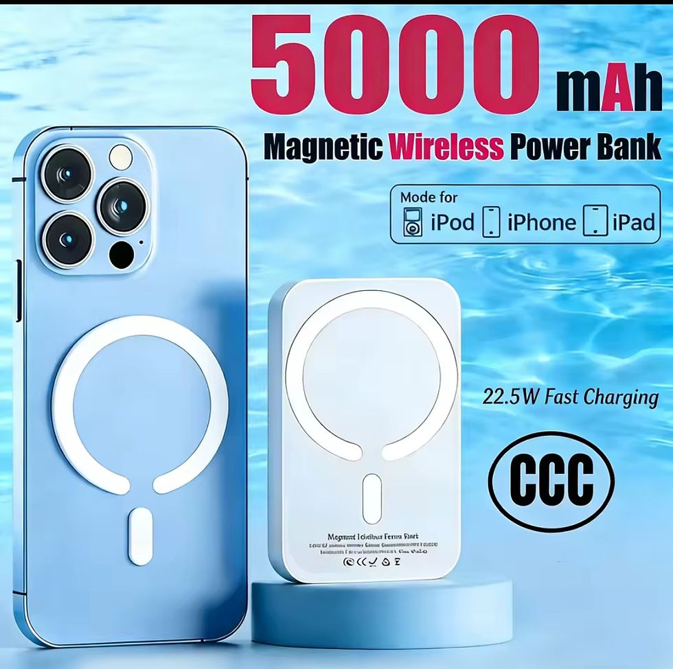 Carregador Portátil Sem Fio de 5000mAh, Bateria Externa Magnética Power Bank